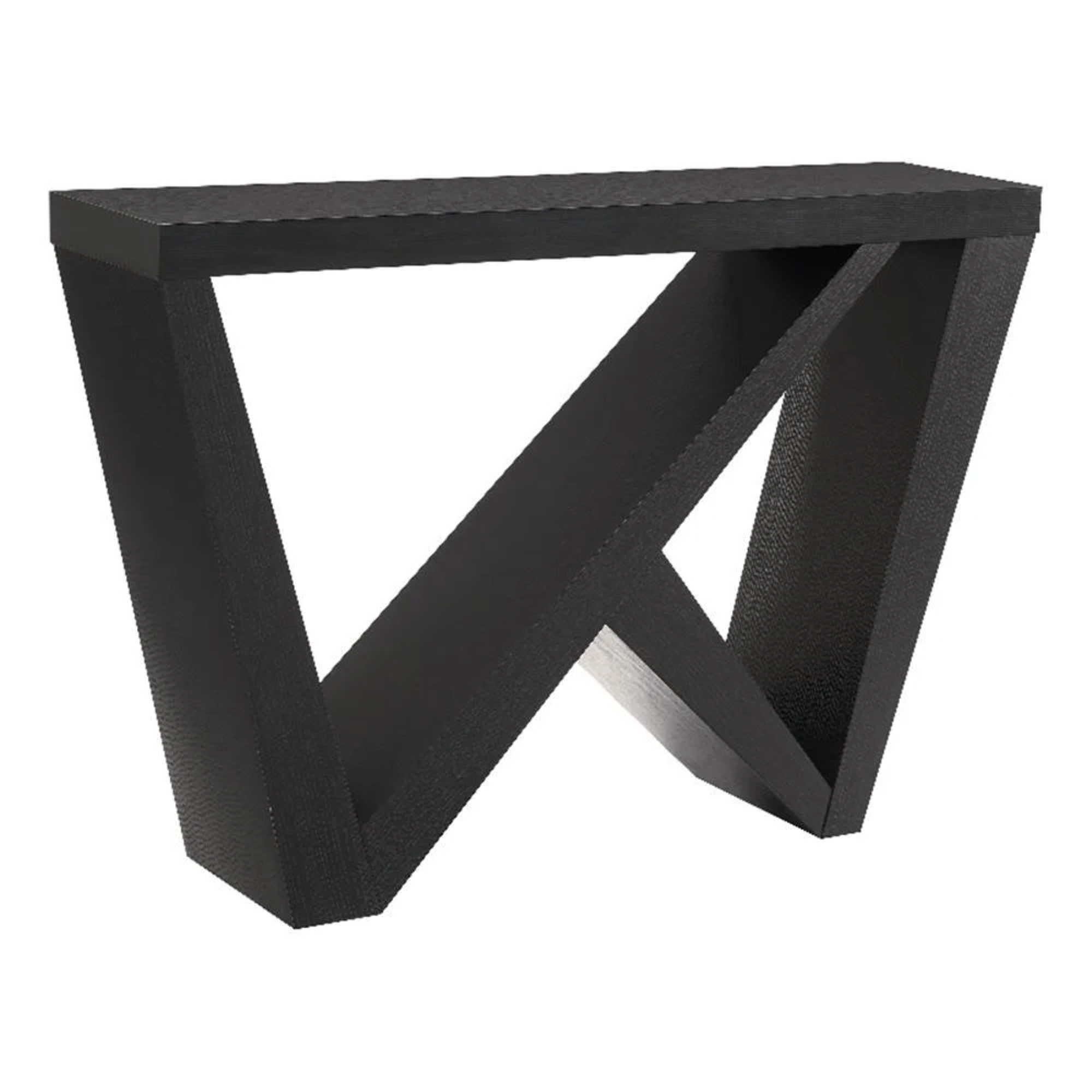 A modern black console table with clean lines and an architectural base featuring intersecting supports. Its sleek silhouette and bold design make it a striking accent for spaces.